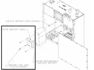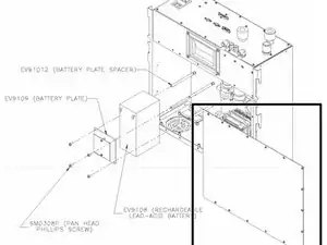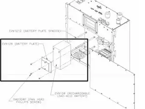 Снимите четыре винта с панелью (SM0308P), которые удерживают батарейный блок (EV9109) и батарею (EV9108), и извлеките панель и батарею.