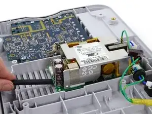 Используйте плоский конец лопатки, чтобы приподнять блок питания с посадочных стоек в заднем корпусе.