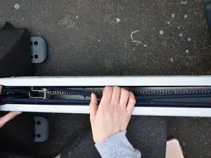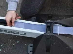 Осторожно выдвиньте защитный кожух через конец рядом со стопорами для ног.