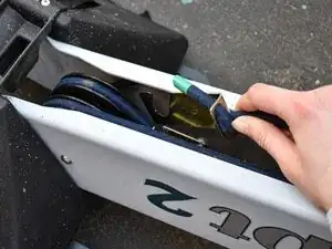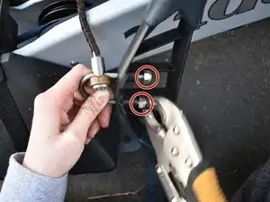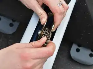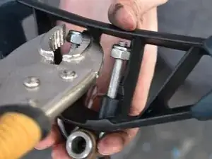 С помощью разводного ключа и отвёртки с крестообразным шлицем Phillips #00 открутите верхний винт диаметром 31,75 мм (1-1/4 дюйма) с плоской головкой из металлической детали на конце машины рядом со стопорами для ног.