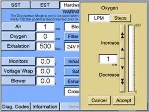 На экране оборудования коснитесь «Кислород» и установите поток на 1 Л/мин. Убедитесь, что дисплей O2Position зарегистрирован в диапазоне от 185 до 525 шагов. (Сервисное руководство 8-19)