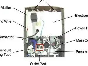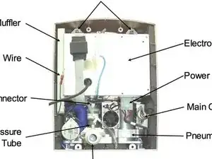 Отсоедините зелёный провод заземления и клемму от пневматического блока (немного выше выходного патрубка).