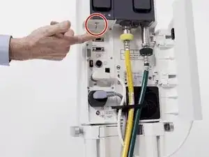 Выключите вентилятор с помощью выключателя на блоке пациента, который расположен в нижней части устройства за белой дверцей.