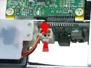 Отключите кабель питания от платы PIM, нажав на фиксирующую защёлку и потянув кабель прямо вверх из разъёма.