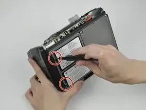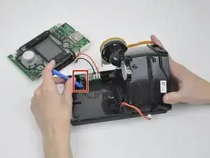 Надавите инструментом для вскрытия вверх на защёлку, чтобы отсоединить прозрачную пластиковую защёлку от соответствующей защёлки на чёрном пластиковом корпусе устройства.