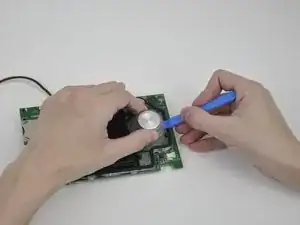 Надавите инструментом для вскрытия на два выступающих прозрачных пластиковых язычка по длинному краю платы, чтобы отщёлкнуть их от платы. Аккуратно нажмите вниз на верхнюю часть язычков и поднимите плату вверх, пока язычки не опустятся немного ниже уровня печатной платы и больше не будут её фиксировать.