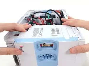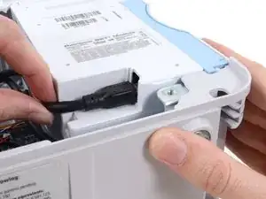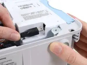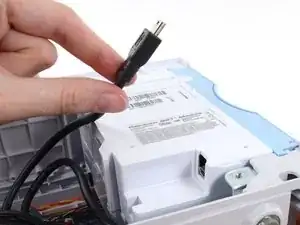 Следующий разъём требует использования двух рук для отсоединения. Переверните заднюю крышку и положите её на спину, чтобы получить доступ к кабелю блока питания.