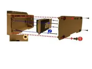 Снимите крышку отсека для батарей, открутив (4) винта Phillips 6-32 X 5/16. Это обозначено красным цветом под номером 1.