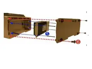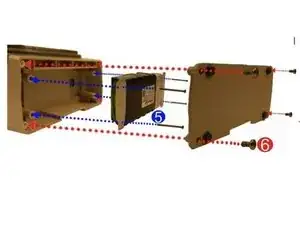 Соберите батарею, подключив её кабель к разъему (потяните за кабель, чтобы убедиться, что он зафиксирован на месте), затем затяните (4) винта Phillips 6-32 X 2 ¼. Это обозначено синим цветом под номером 5.