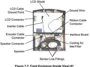 Используйте гаечный ключ-насадку, чтобы снять (2) стопорные гайки 4 мм с места установки разъёма ЖК на передней крышке. Снимите алюминиевую U-образную скобу с места разъёма ЖК и вытащите разъём и кабель ЖК.