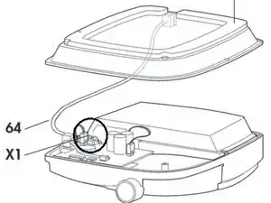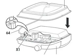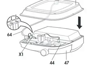 Установите нижнюю часть корпуса на верхнюю часть (47). Убедитесь, что основная плата (44) правильно выровнена и что соединительный кабель (64) нигде не зажат. (стр. 24)