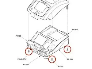 Откройте устройство, удалив пять крепёжных винтов (Pl1.20) на боковой стороне нижней крышки (Pl1-280). Снимите верхнюю внешнюю панель.