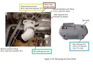 ПРИМЕЧАНИЕ: При повторной установке трубок убедитесь, что: • Более длинная (9‑дюймовая) трубка подключена между штуцером коллектора «M» (машина) и накидным штуцером выхода газа. • Более короткая (8‑дюймовая) трубка подключена между штуцером коллектора «P» (проксимальный) и накидным штуцером проксимального порта давления.