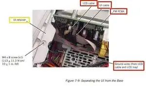 Отключите кабели: • кабель ЖК‑экрана от платы управления питанием (PM PCBA). • проводники заземления кабеля ЖК‑экрана от клеммы заземления. • проводники заземления лотка ЖК‑экрана от клеммы заземления. • кабель интерфейса (ленточный кабель) от платы PM.