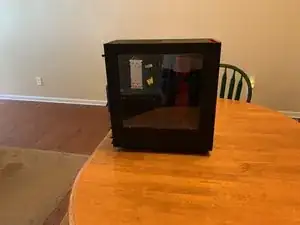 Снимите боковую панель, нажав на защелку в верхней части корпуса наружу. Как только боковая панель будет освобождена, снимите её и отложите в сторону.