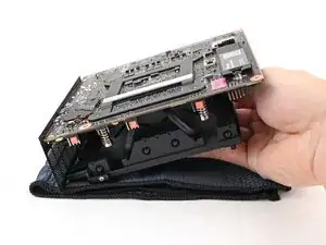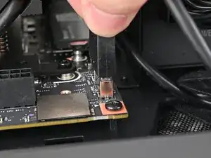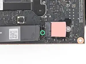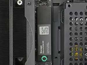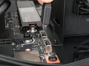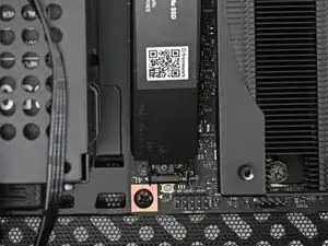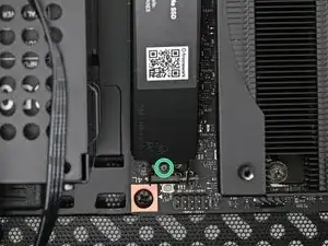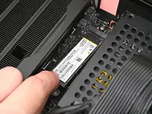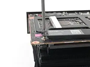 Вставьте ваш отвертку Framework Desktop в неподвижный винт на основном теплораспределителе накопителя и прижмите его к материнской плате.