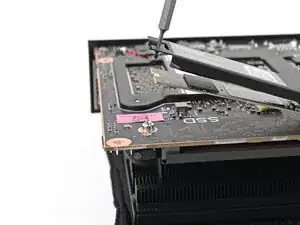 Вставьте отвертку Framework Desktop в фиксирующий винт на теплоотводе вторичного накопления и прижмите его к материнской плате.