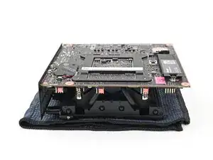 Поместите материнскую плату на рабочую поверхность так, чтобы её радиатор лежал на мягкой, чистой ткани.