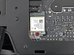 Поверните скобу над Wi‑Fi‑модулем, убедившись, что отверстие для винта не перекрыто антенными кабелями.
