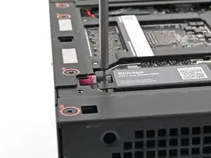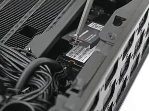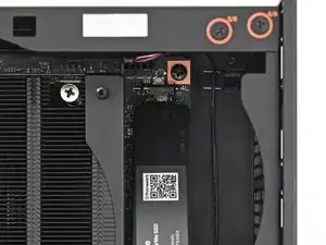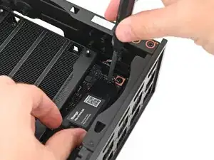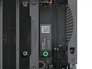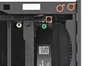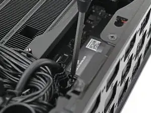 Придерживая одной рукой радиатор дополнительного накопителя, используйте отвертку Framework Desktop, чтобы выкрутить винт T5 Torx длиной 4,5 мм, который его крепит.