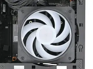 Уложите вентилятор поверх радиатора, убедившись, что кабель(и) проложены так, чтобы выходить через отверстие в верхней части компьютера.