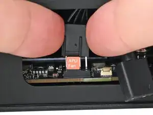 Наденьте основной кабель вентилятора на четырехконтактный разъем с маркировкой "APU Fan", убедившись, что оранжевая метка встала между вертикальными линиями.