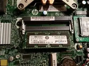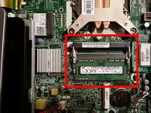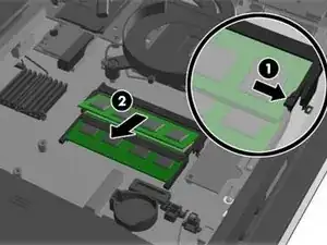 Найдите слоты SODIMM. Чтобы извлечь модуль памяти, нажмите наружу на две защёлки с каждой стороны SODIMM, затем выньте модуль из гнезда.