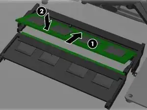 Чтобы установить новый модуль(и) памяти, вставьте SODIMM в гнездо под углом примерно 30 градусов, затем нажмите модуль вниз, чтобы защёлки зафиксировали его на месте.