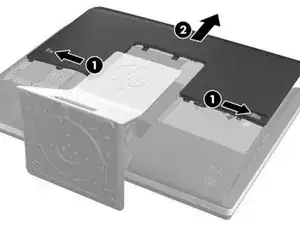 Чтобы снять крышку: сдвиньте защёлки на правой и левой сторонах задней крышки в сторону краёв устройства, затем сдвиньте крышку по направлению к верхней части компьютера, пока она не сойдёт с корпуса.