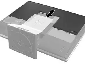 Чтобы вернуть заднюю крышку (панель доступа), установите панель на задней части компьютера чуть выше подставки и сдвиньте её вниз на место.