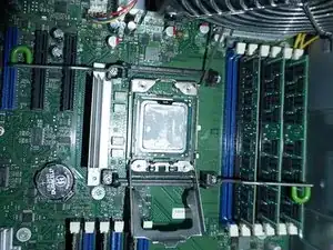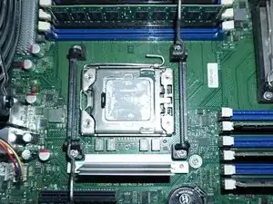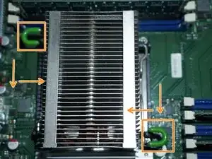 Нажмите на две зелёные защёлки и поднимите вентилятор над процессорами.