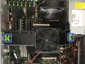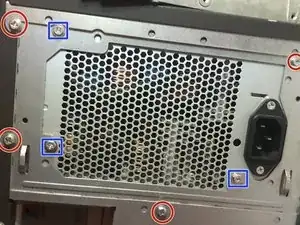 Внешние винты (в синем) крепят блок питания к его корзине и подлежат снятию после извлечения из корпуса.