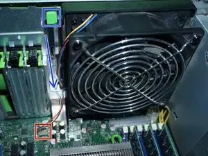 Будьте осторожны и действуйте аккуратно, кабель вентилятора короткий (красная стрелка).