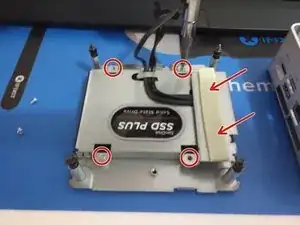 Выверните четыре серебристых винта, которые крепят жёсткий диск в кронштейне. Металлический экран с термопрокладкой в красном поле снимется: он полезен при установке твердотельного накопителя-«лезвия», так как изолирует его от металла.