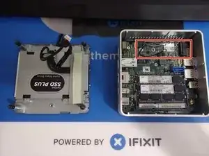 Поднимите крышку и следите за кабелями, подключёнными к материнской плате NUC. Эти кабели обеспечивают питание и передачу данных для отсека 2,5" жёсткого диска.