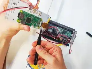 Возьмите ленточный кабель камеры RPI и подключите его к камере, установленной на задней стороне передней платы. ПРИМЕЧАНИЕ: работайте пинцетом и осторожно подключайте ленточный кабель к камере.
