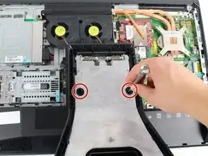 Используйте отвёртку Torx T15 и вставьте её в отверстия на подставке, чтобы выкрутить два винта 12 мм на задней части основного блока.