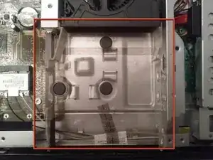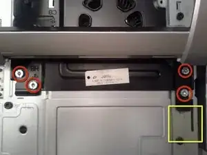 Удалите 3 винта (2 помечены «PS-U»), удерживающие блок питания на месте. Четвёртый винт, ближайший к краю корпуса, снимать не обязательно; он фиксирует подставу блока питания.
