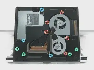 Удалите пять винтов Torx, удерживающих два вентилятора в средней рамке