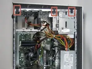 Теперь поставьте ваш настольный компьютер вертикально и удалите 3 зажима с правой стороны передней панели.
