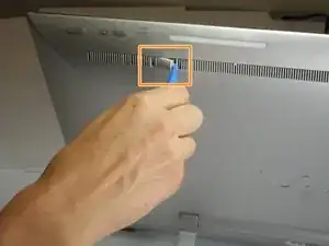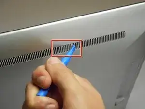 Используйте ваш пластиковый инструмент открытия, чтобы удалить правый пластиковый фиксатор, blocking the screw mounts behind the device.