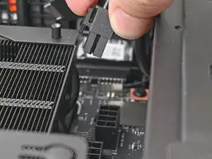 Удерживая за фиксатор кабеля питания CPU, вытяните его строго вверх из гнезда, чтобы отключить.