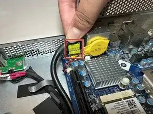 Отключите прямоугольный жёлтый связаный кабельный разъём, подключённый к материнской плате.