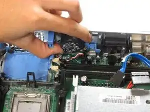 Нажмите на синий фиксатор и извлеките вентилятор.