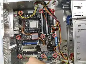 Удалите девять винтов с головкой Phillips #2 длиной 5 мм с материнской платы. Убедитесь, что компьютер установлен на боку, чтобы после удаления винтов ничего не упало и не повредилось.