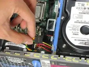 Удалите источник питания, который подключает нижний вентилятор к материнской плате, отличающийся черными, красными, зелеными и желтыми проводами.