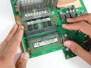 Нажмите вниз на две металлические защёлки по обеим сторонам планки ОЗУ. Планка при этом слегка подскочит вверх.