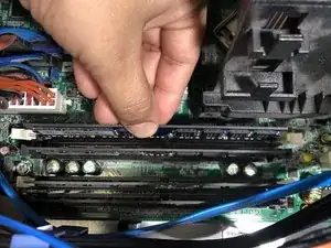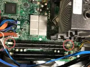Чтобы освободить планку памяти, нажмите на два фиксатора с обеих сторон слота.