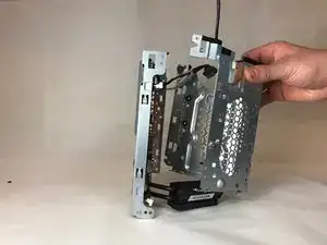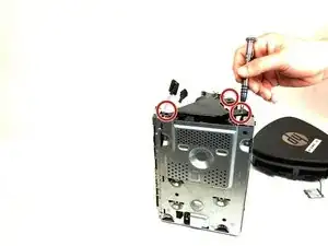 Извлеките HDD: сначала отверткой Phillips #2 выкрутите четыре винта 23 мм, удерживающие сборку, затем вытащите HDD из шасси.