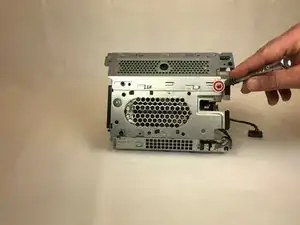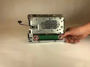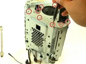 Снимите верхнюю панель, отверткой Torx #15 выкрутите три винта 24 мм и отверткой Phillips #00 — один винт 24 мм по внешнему краю шасси.